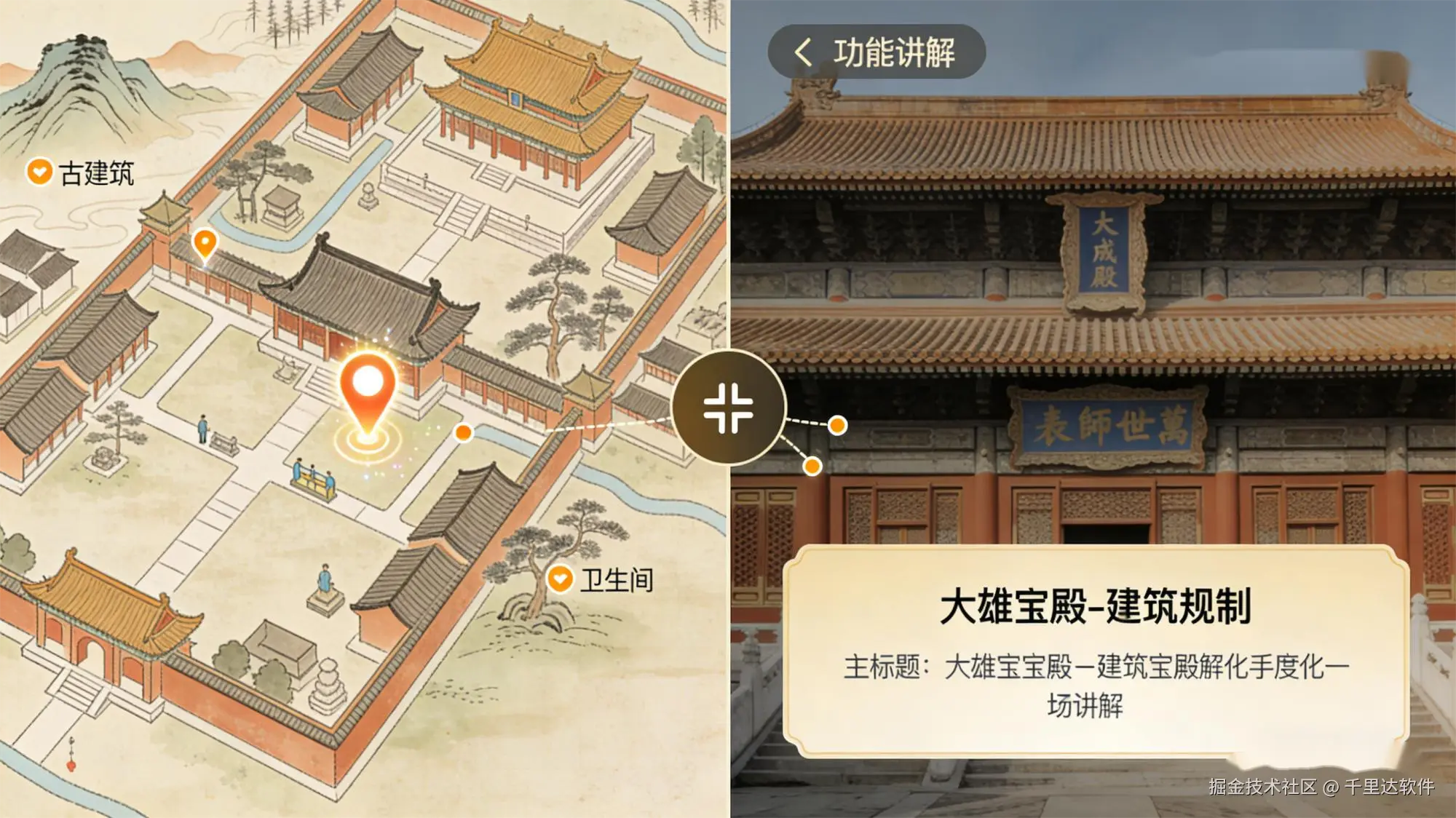 千里达的同步导览技术,早已突破单一景区场景,延伸到更多文化空间:在博物馆,跟着手绘地图逛展,展品讲解精准同步,仿佛拥有私人策展人;在历史文化街区,踏着青石板路,耳边传来老巷的百年故事,沉浸式感受城市底蕴;就连校园参观、园区导览,也能通过手绘地图+实时讲解,让访客快速熟悉环境。