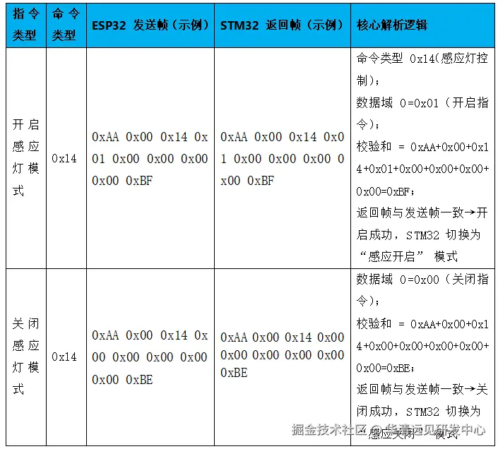 5.双芯通信协议 :9字节固定帧格式,支持感应灯控制指令(0x14),数据域0表示开启/关闭状态