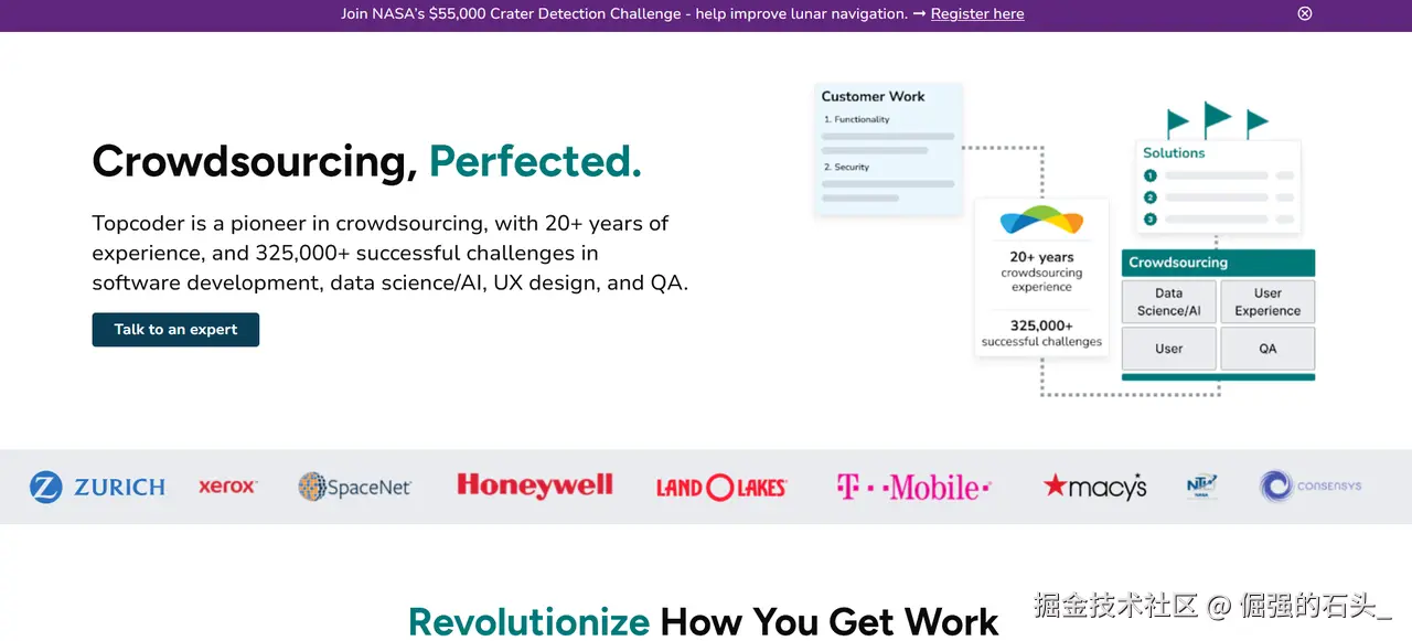 Topcoder 的模式和常规程序员接单并不完全一样,很多需求通过竞赛或技术挑战完成,更强调技术能力本身。