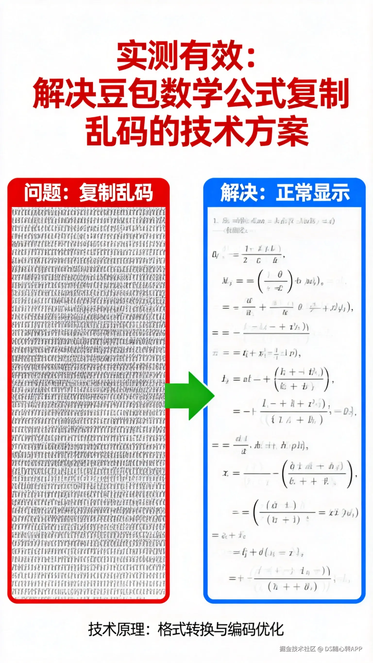 (此处建议插入 2 张对比截图:左图为豆包直接复制后的乱码效果,右图为 DS 随心转转换后的正常公式效果,突出“无损还原”核心亮点)