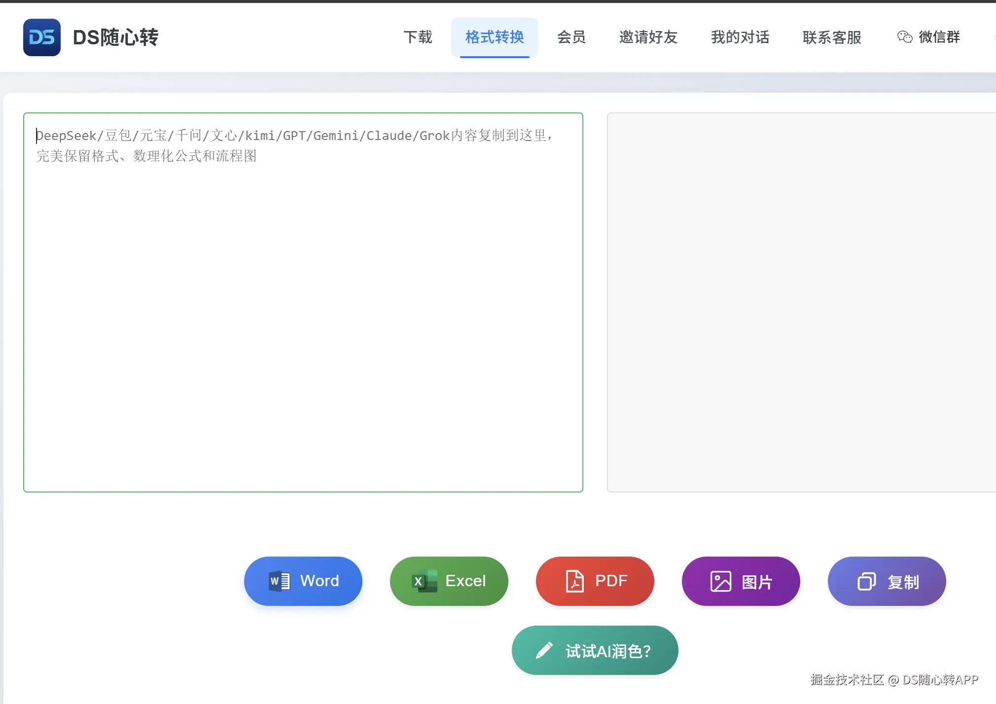- 将复制的 Markdown 内容粘贴到 DS 随心转的输入框中,此时工具会自动识别 LaTeX 公式标记;