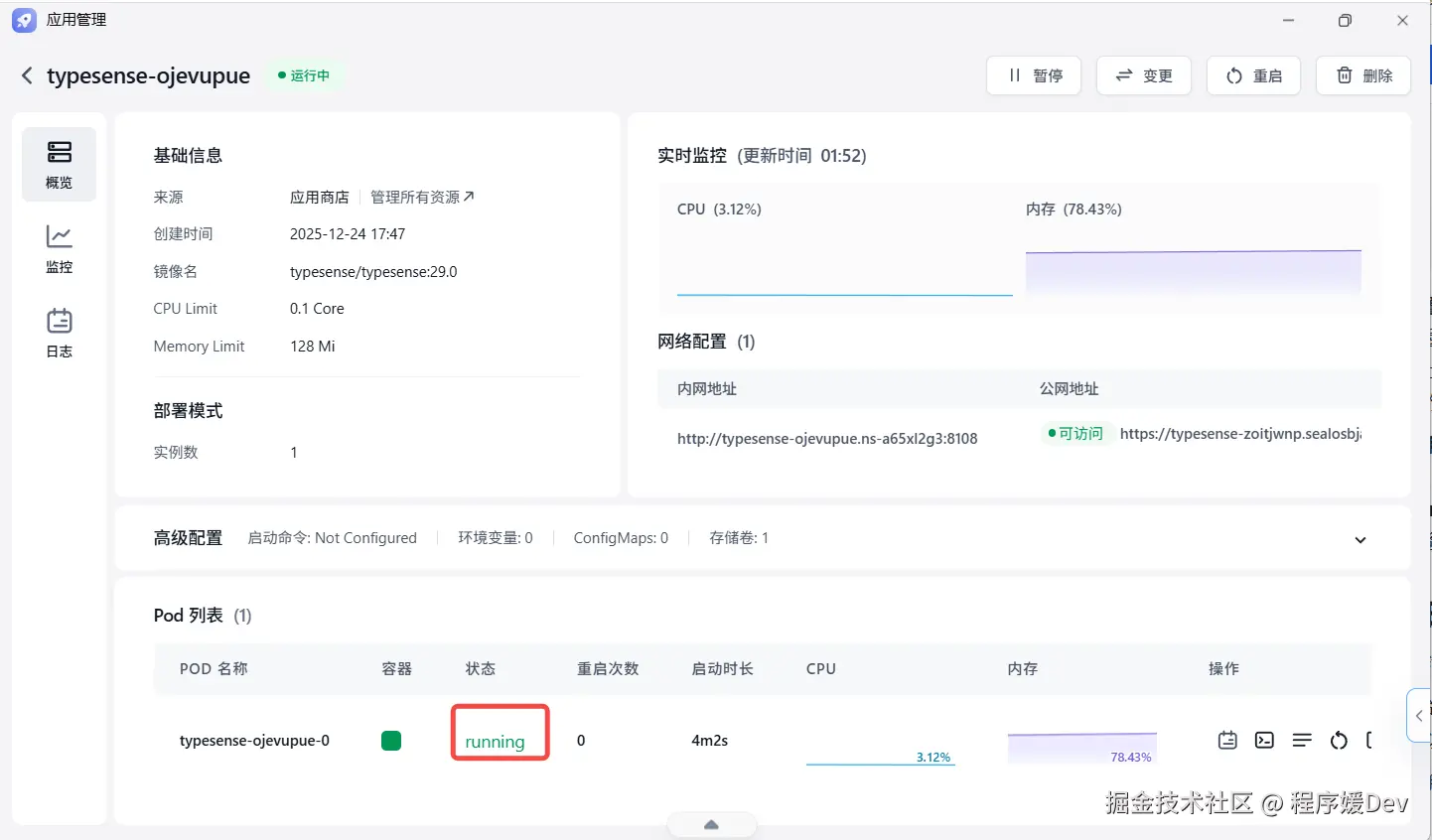 - 第三步:等待部署成功,获取服务地址 整个过程不到 3分钟,应用状态就变成了 Running。在“网络配置”部分,我找到了 Sealos 为我生成的公网访问地址,比如