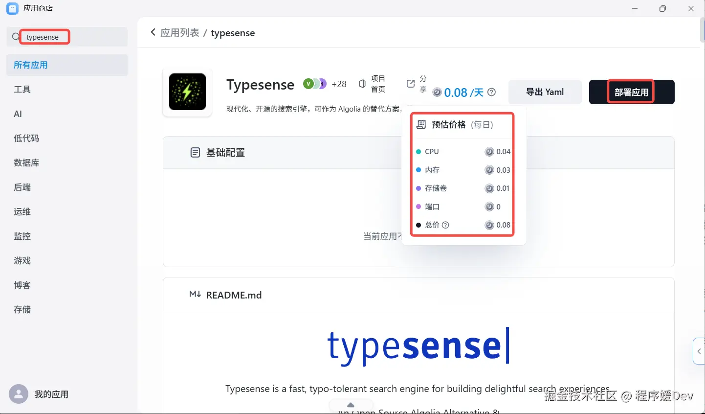 - 第二步:配置 API Key 并一键部署 在部署页面,我看到了 单日预估费用。关键的一步来了,在“基础配置”中,有一个 API Key 的输入框。我在这里设置了一个足够复杂的管理员密钥,然后直接点击右上角的“部署应用”。这个密钥就是未来我和 TypeSense 服务交互的“密码”。