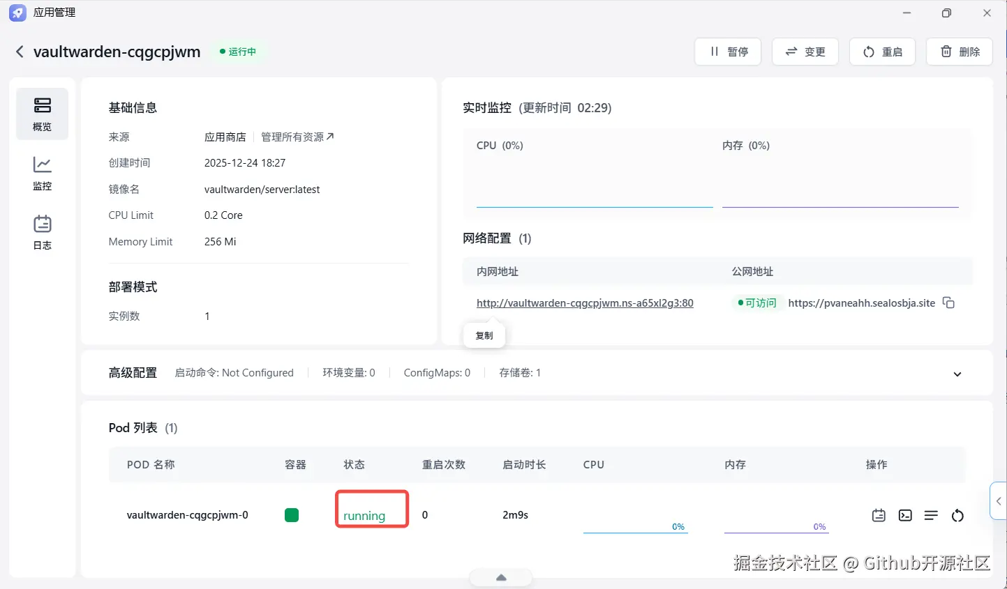 - 第三步:获取安全访问地址 大约 2分钟 后,应用状态变为 Running。我点开“网络配置”,惊喜地发现 Sealos 不仅为我生成了公网域名,而且 默认就开启了 HTTPS!域名前面有一个小锁的标志,这意味着我的密码库从一开始就运行在安全的加密通道之上。