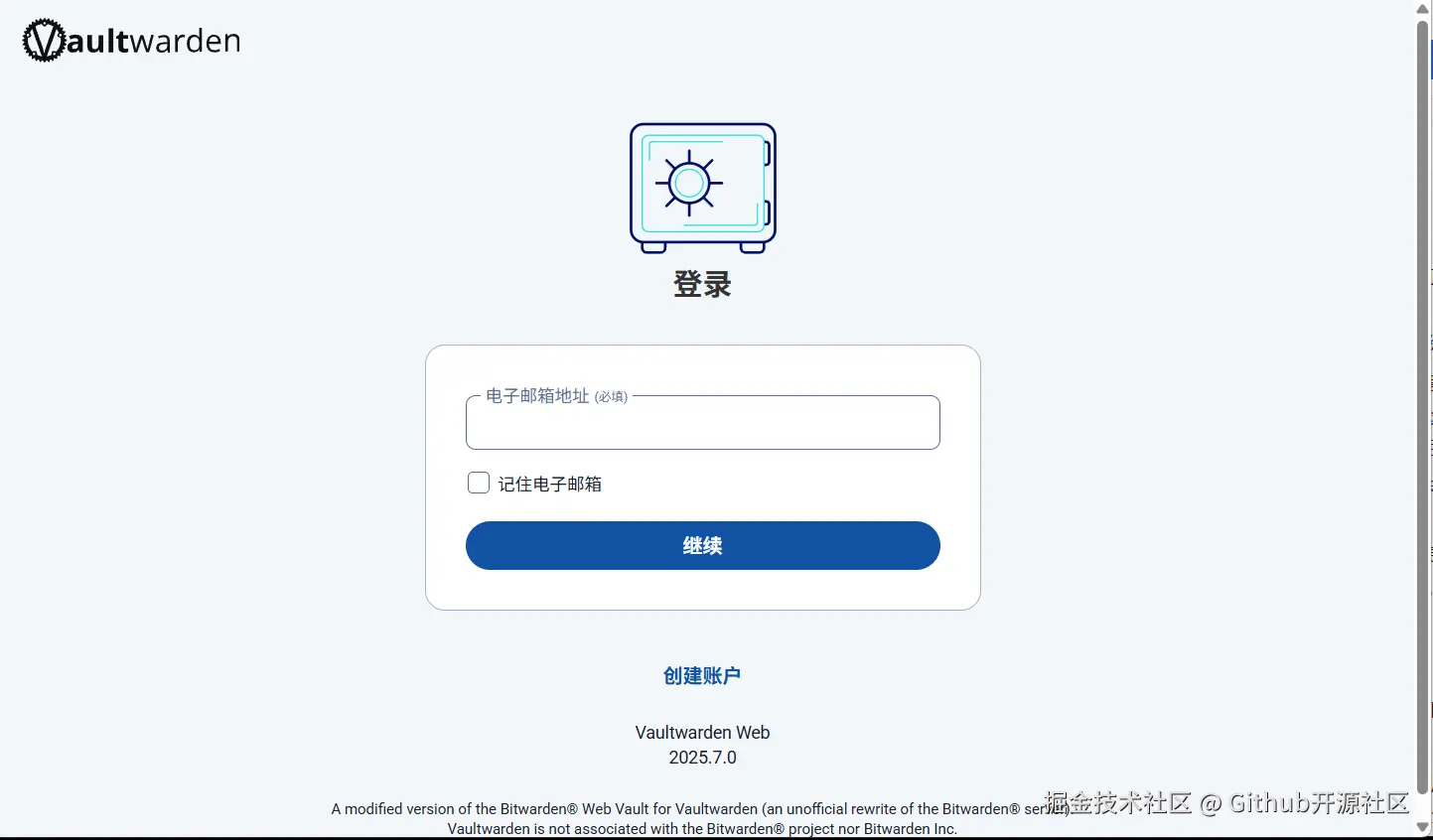 - 创建账号:我通过 Sealos 提供的 HTTPS 地址访问我的 Vaultwarden,点击“创建账户”,注册了我的主账号。注意,因为这是我的私有服务,我可以在管理后台关闭新用户注册,防止被滥用。