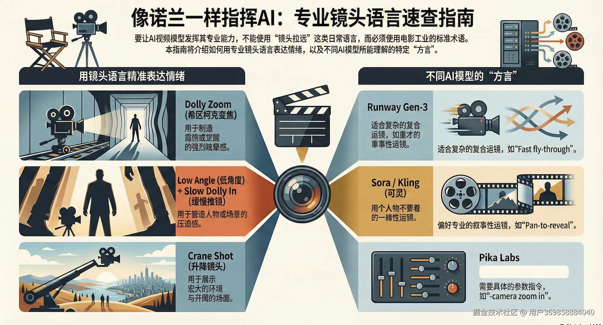 AI模型“看过”人类历史上几乎所有的电影,它比你更懂摄影术语。用“镜头拉远”这种自然语言是业余的,必须使用电影工业标准术语来触发模型的专业能力。