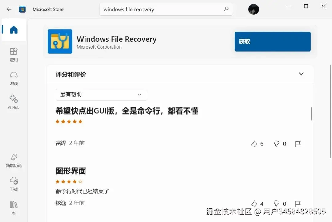 微软原版的WinFR只支持命令行操作,对于不熟悉电脑的小白来说确实有点难度。微软商店里也是清一色吐槽这件事:
