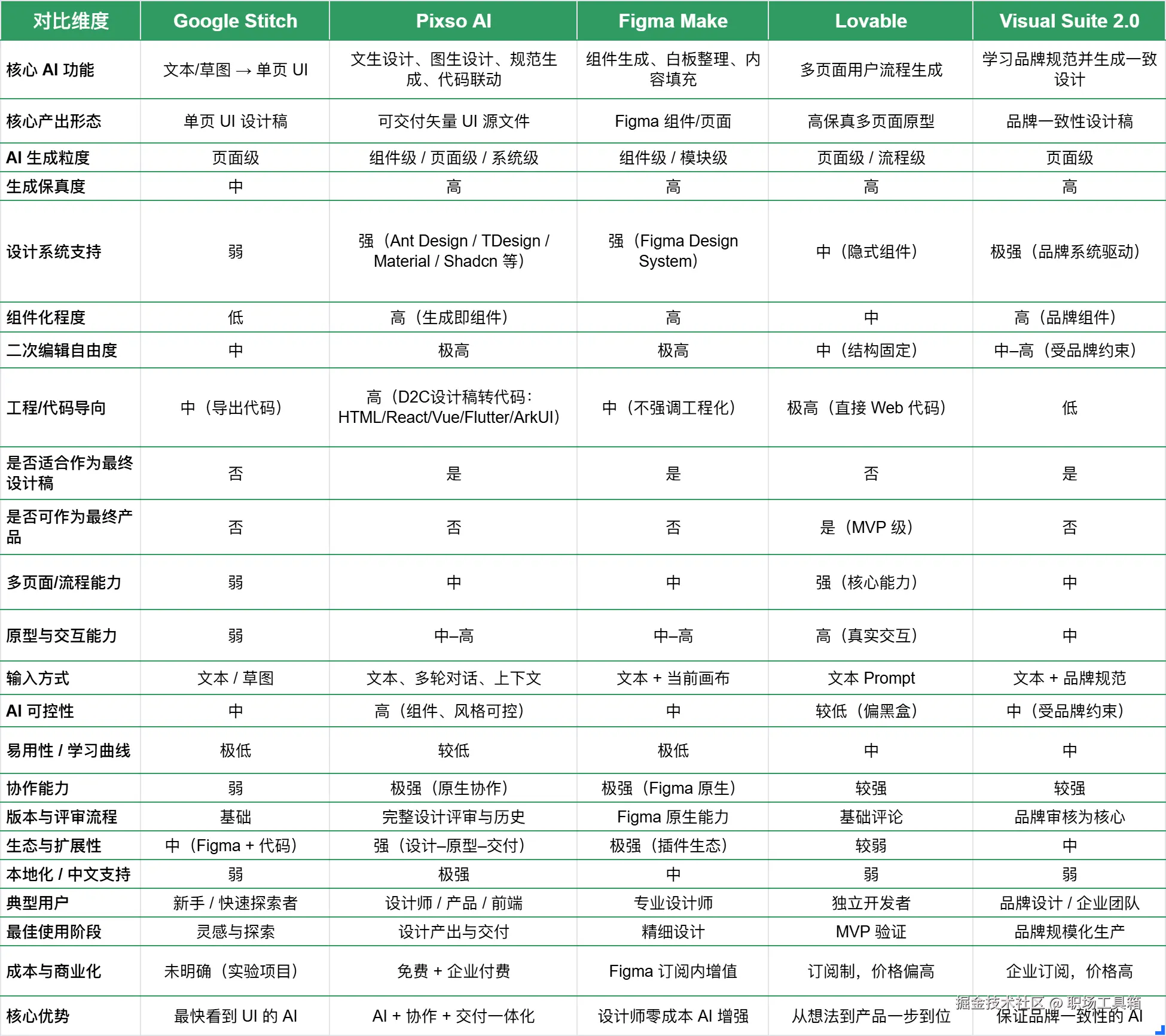在AI设计工具百花齐放的今天,除了 Google Stitch,市场上还有多款表现卓越的工具。以下是对 Pixso AI、Figma Make、Lovable 和 Canva Visual Suite 2.0 的深度剖析。