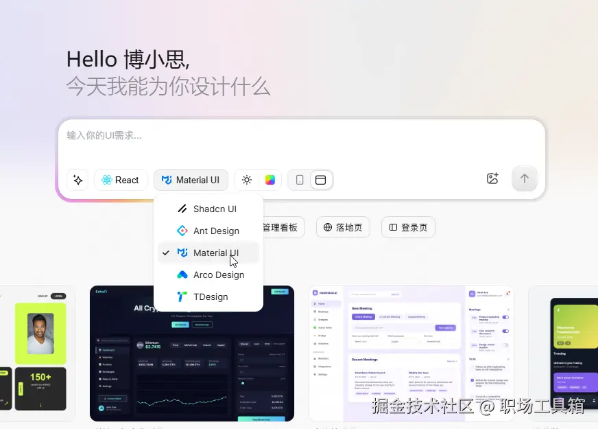 海量训练:经过海量UI设计数据集(网页、App、设计规范、前端代码)的训练,模型掌握了布局、色彩、排版等专业设计原则。