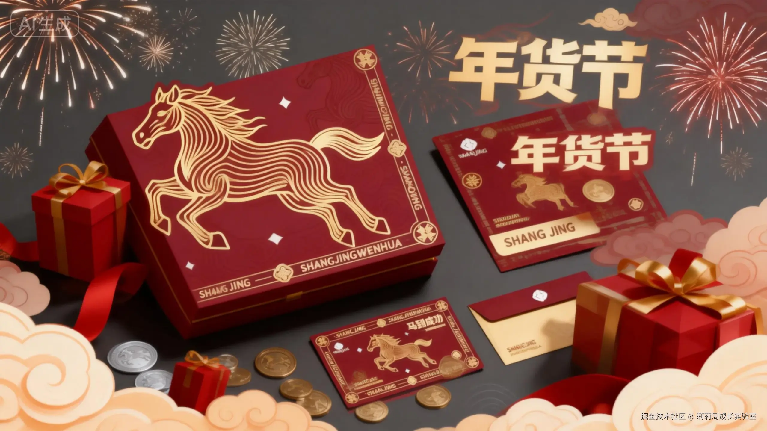 品类:新年礼盒套装设计,包含主礼盒、手提纸袋、卡牌和金属徽章