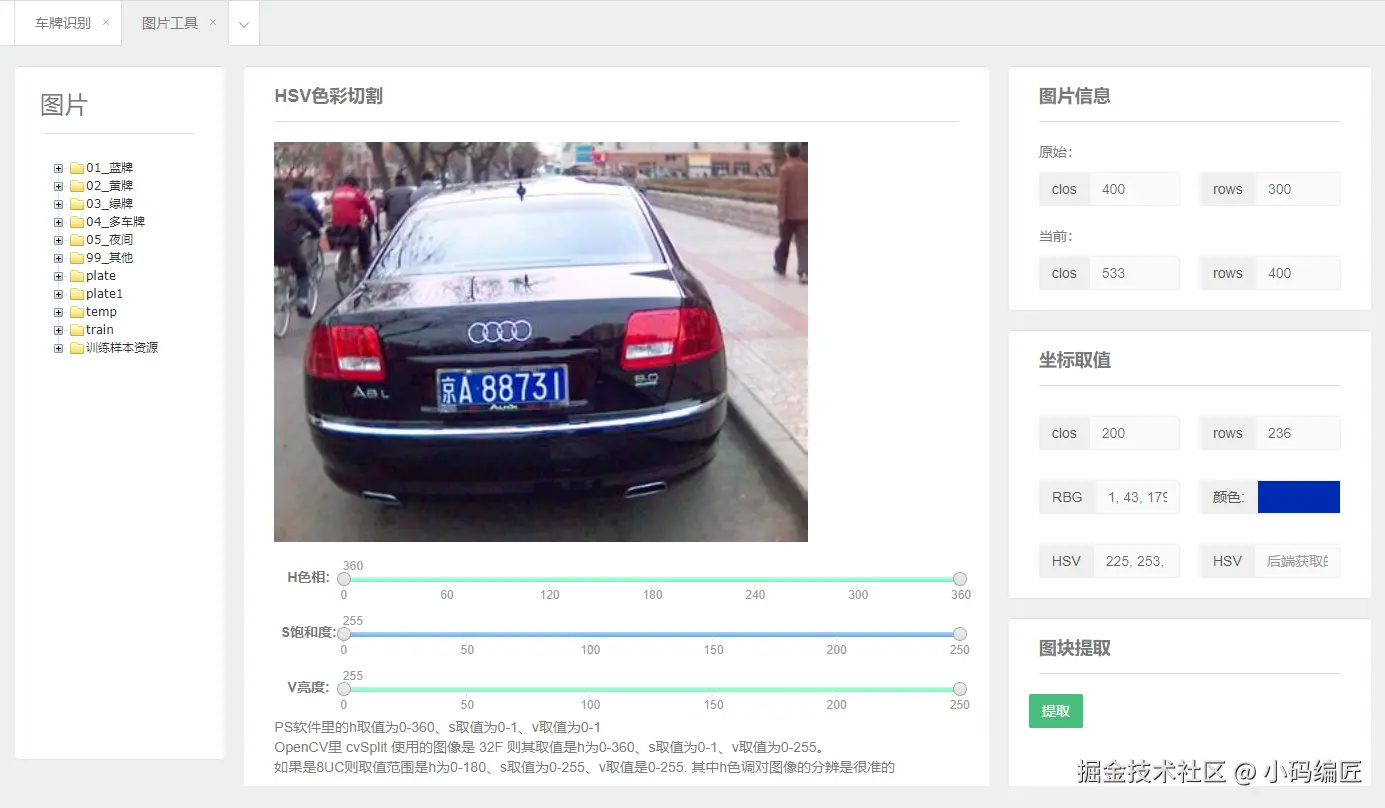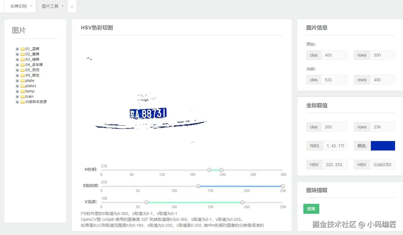 支持蓝、绿、黄三色车牌的检测与号码识别,包含完整的模型训练流程。例如,通过SVM算法训练车牌颜色分类器,再结合ANN网络识别字符序列,最终输出结构化车牌信息。