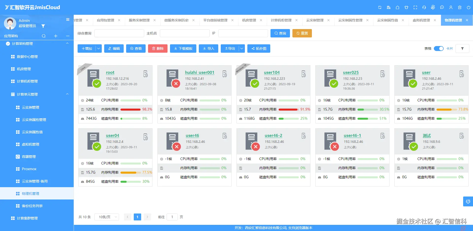 智慧运维底座实现了应用架构(软件)和计算架构(硬件)的智能适配,支持根据访问量和运算负荷自动调配、调度、启停硬件资源。确保企事业以最低硬件配置和投入达到信息化和智能化服务能力,支持企事业单位根据自己的业务场景负荷动态调配算力启停,实现最低的能源消耗和硬件损耗。基于智能运维底座,JmisCloud极大地提升系统的高可用性,可以打造“不会宕机”的高鲁棒性服务。