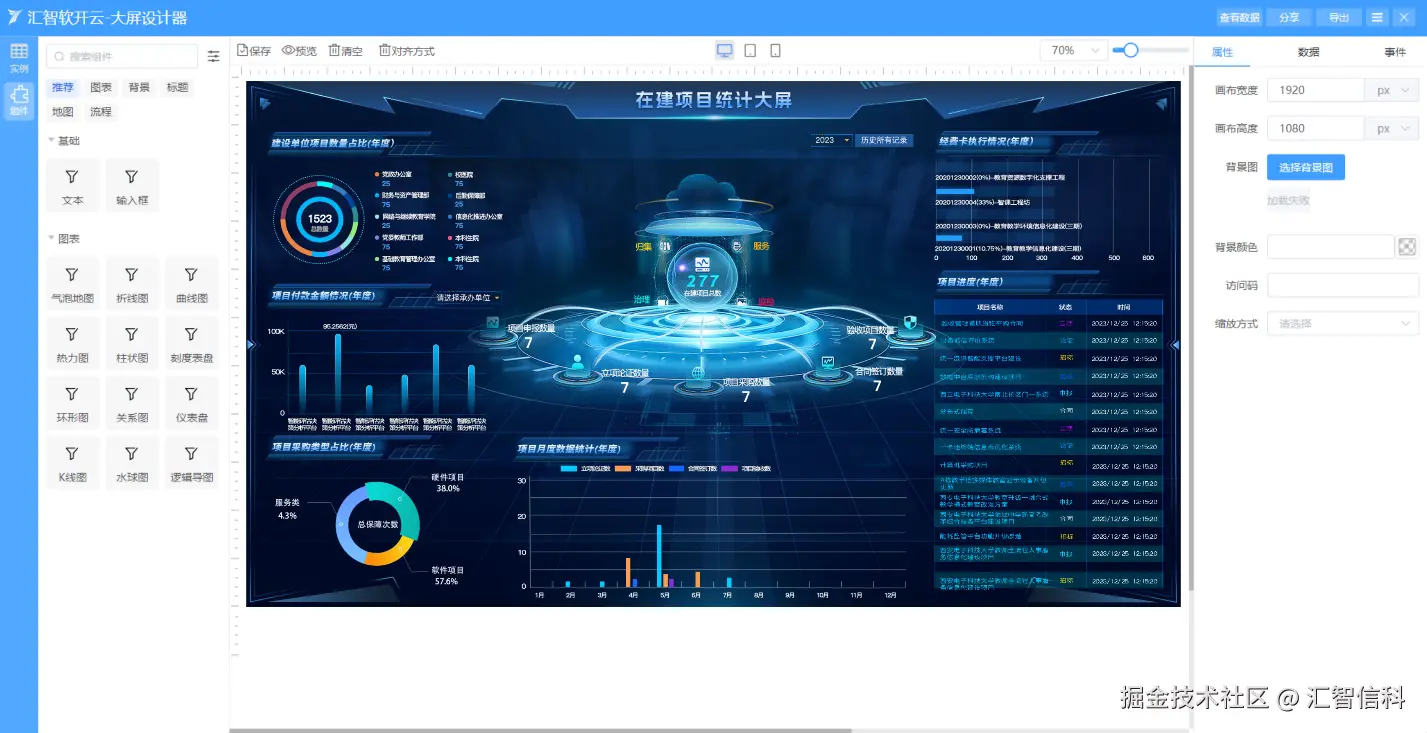 在大屏设计上,在行业可以实现专业UI水准的大屏设计效果,无级缩放、锚定对齐、数据绑定、更新聚合,极大提升系统性能和视觉效果。