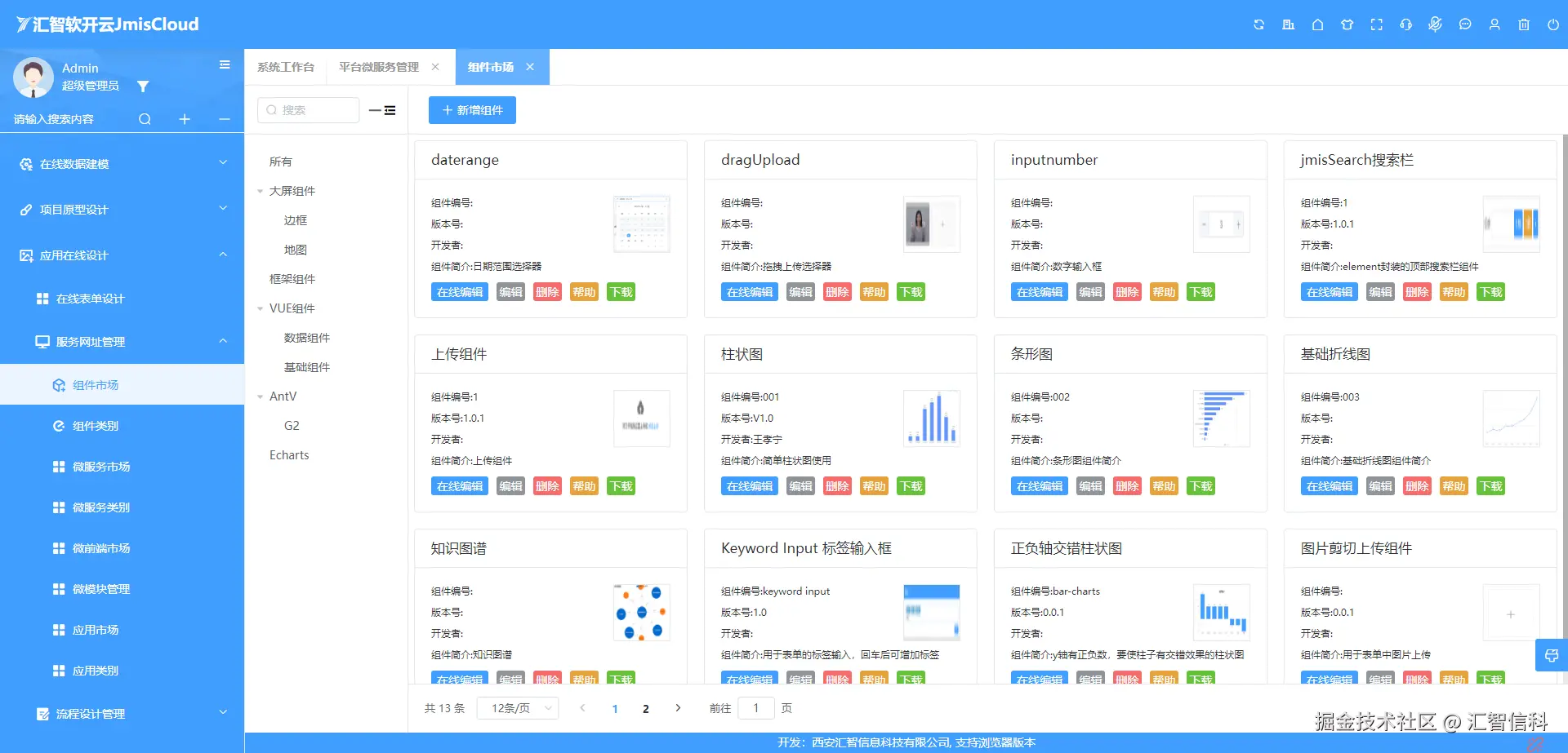 JmisCloud提供组件、应用的高效管理,提供组件市场、页面模版、中间件市场和应用市场的多层次的协同生态,无缝支持私有应用与SaaS应用的切换融合;为Java后端、Web前端、Python、C++、UI设计、原型设计、测试、配置管理等岗位的开发人员提供高效的协同平台。对公司客户,可以实现软件开发从设计、开发、管理到测试人员的高效协同,也为广大IT工作者基于JmisCloud创作组件、页面、微服务、微前端提供价值兑现平台。