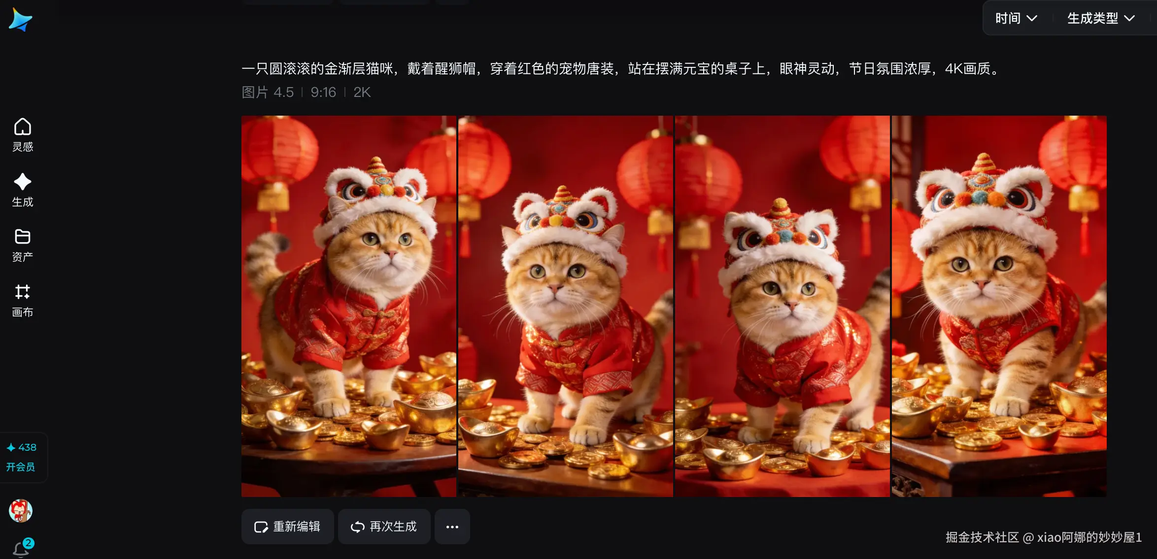 - Prompt:使用即梦生图4.5模型,一只圆滚滚的金渐层猫咪,戴着醒狮帽,穿着红色的宠物唐装,站在摆满元宝的桌子上,眼神灵动,节日氛围浓厚,4K画质。