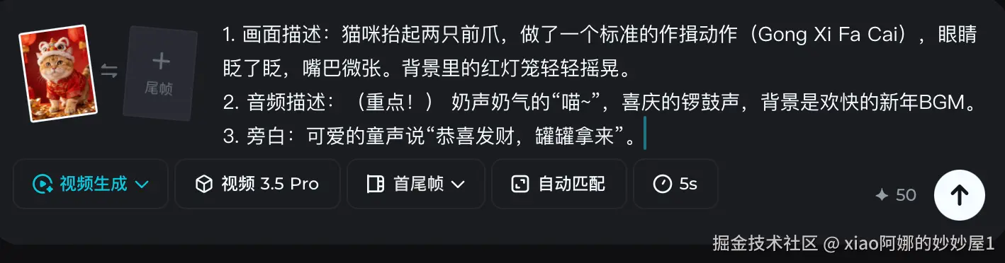 - 音频描述:(重点!) 奶声奶气的“喵~”,喜庆的锣鼓声,背景是欢快的新年BGM。