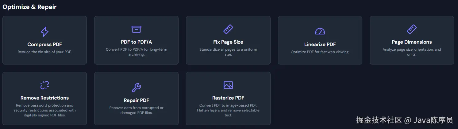 提供 PDF 压缩、修复、栅格化等工具。