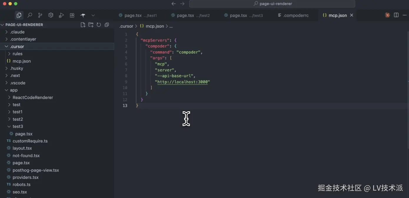 这个 MCP server 的配置会在执行 compoder init 的时候,自动生成在项目中来,如我们选择的 AI Coding 基建是 Cursor,则会在项目中生成一个 .cursor/mcp.json 文件,内容如下: