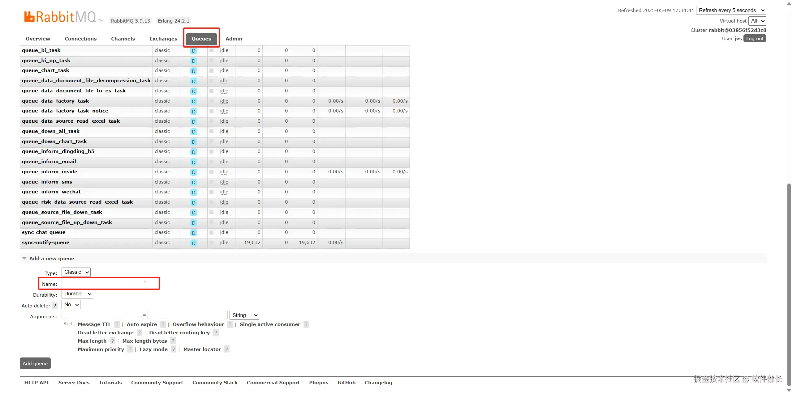 3、打开RbbitMQ后台管理页面:jvs-rabbitmq:15672或者ip:15672。登录账号密码默认为jvs。