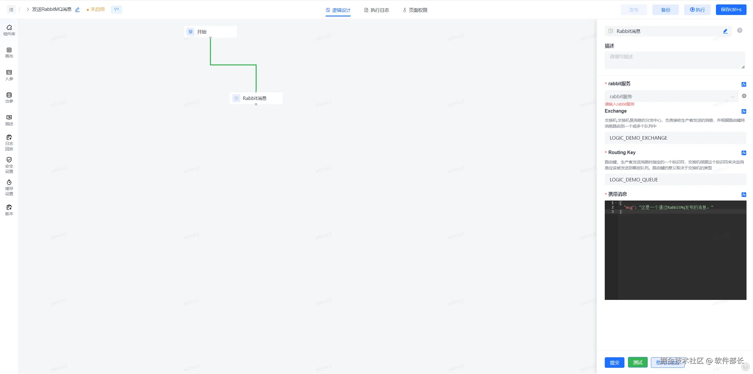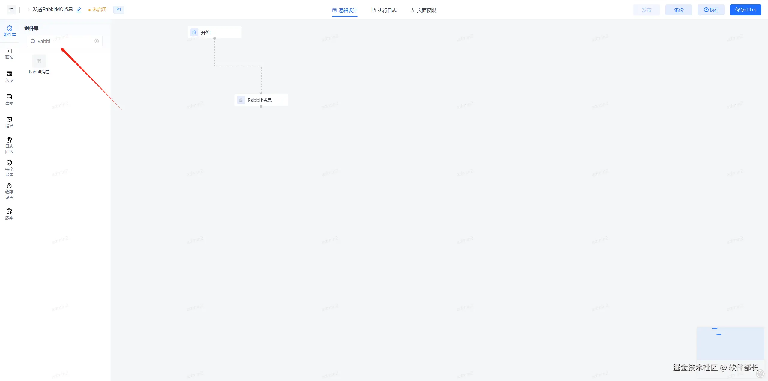 1、使用Rabbit消息节点,可在组件库-工具插件中找到“Rabbit消息”节点。