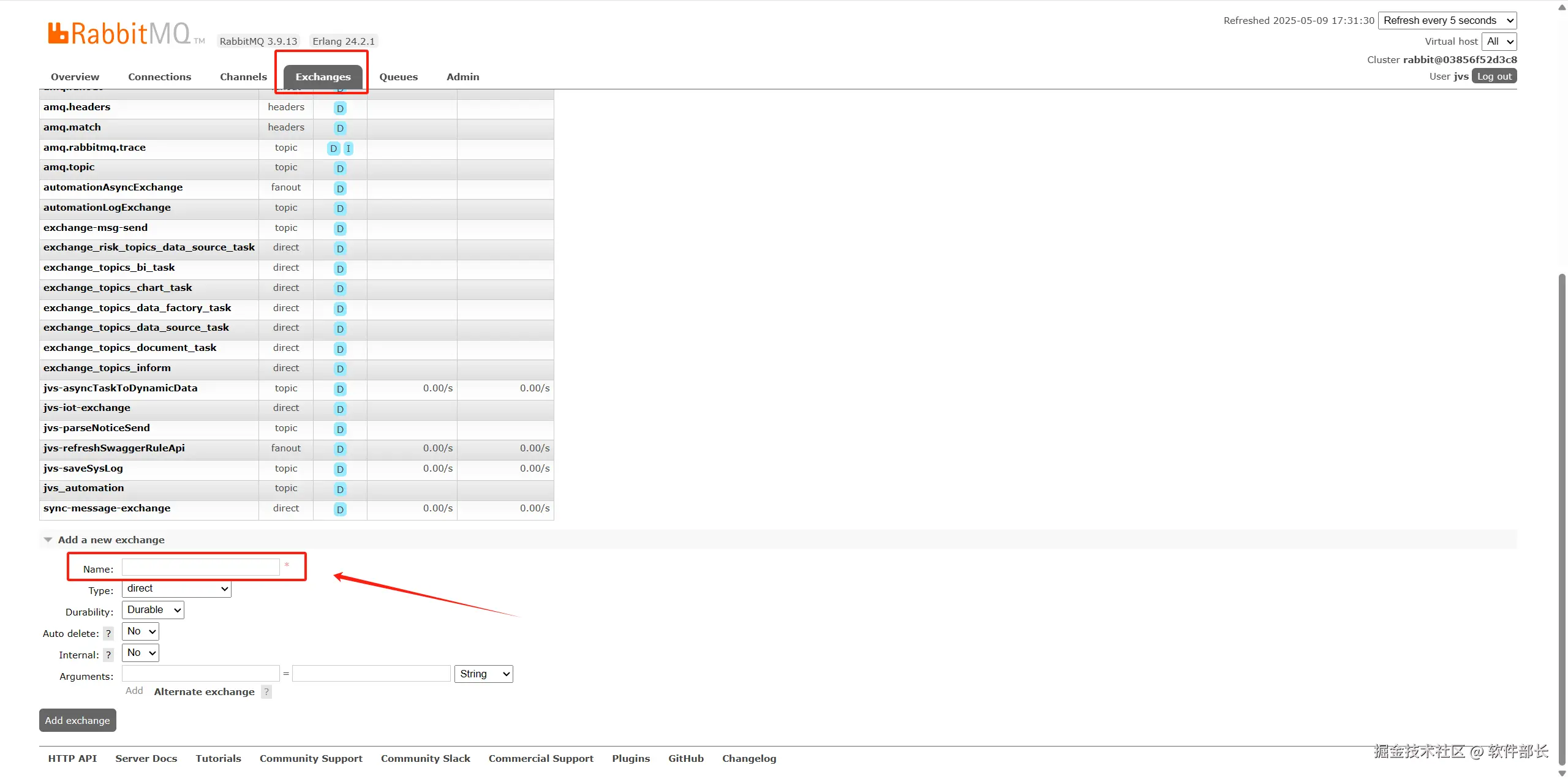 Exchanges中新增一个exchange,并填写上一步中设置的字符串。此处为“LOGIC_DEMO_EXCHANGE”。