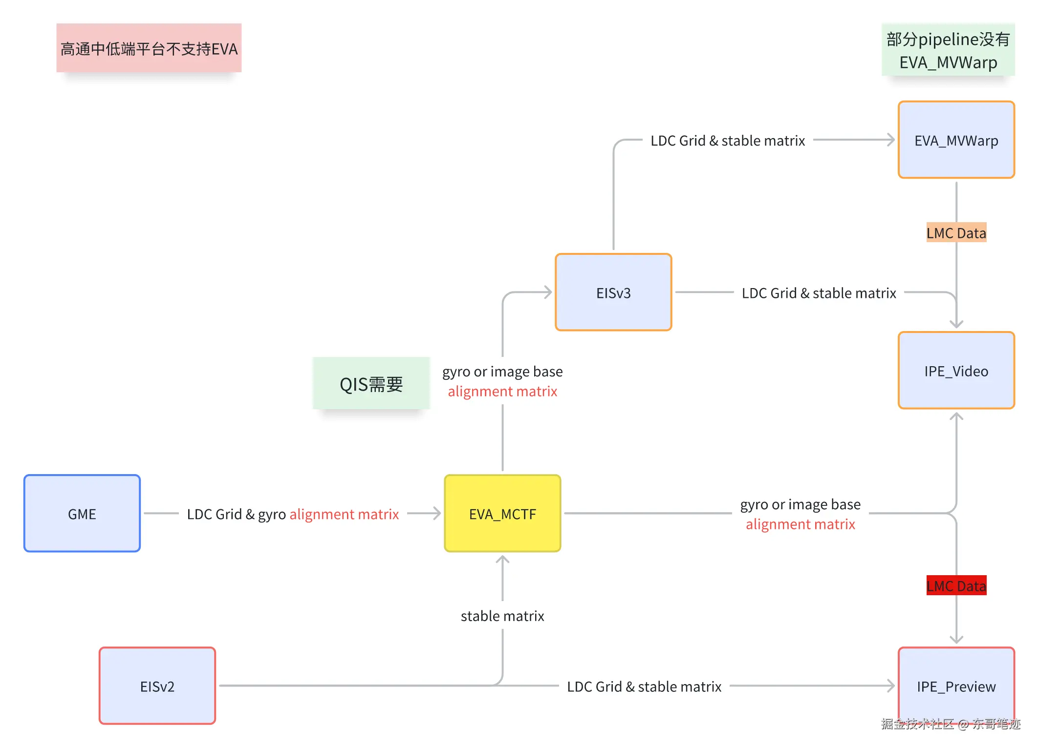 - IPE 模块分两路:EISv2 对接 IPE_Preview 支撑预览流,EISv3 对接 IPE_Video 支撑录像流,同时结合 EVA 输出的对齐矩阵、LMC 数据完成防抖、TF降噪效果。