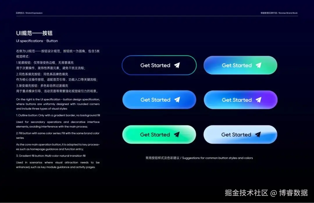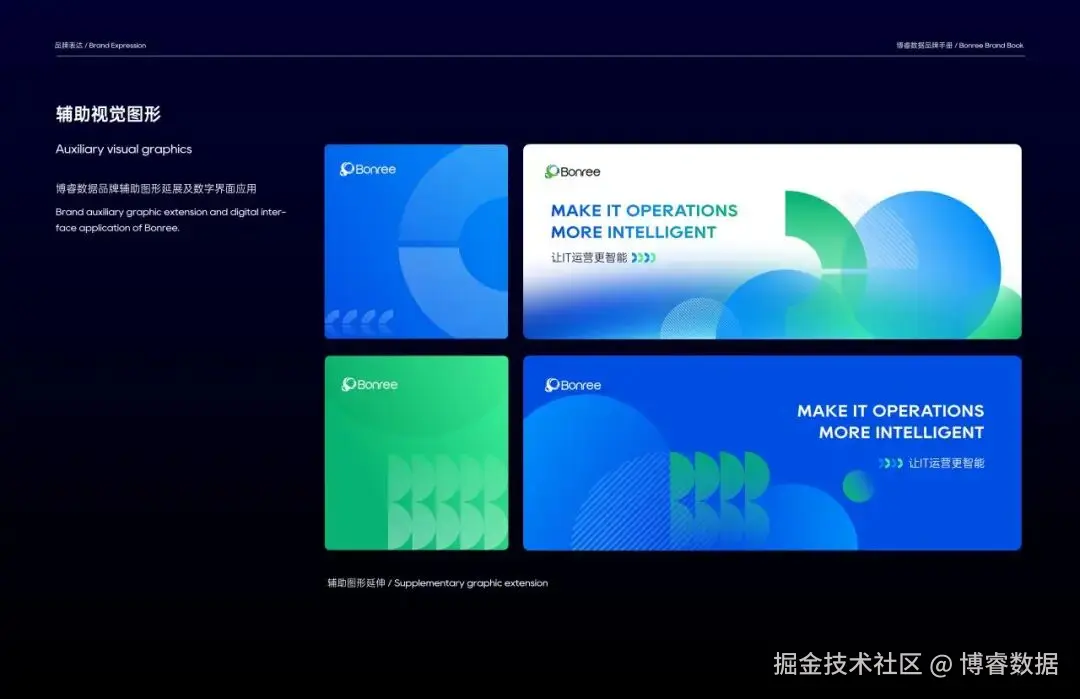 色彩体系选择上,我们以标志性的蓝绿渐变为主色——“洞察蓝”承载科技理性,呼应数据技术的精准可靠;“睿智绿”传递创新生机,契合数字化转型的活力属性。双色交融,共同诠释博睿数据“技术驱动 + 生态共生”的品牌基因,辅以衍生品牌渐变色,以流动感与层次感传递丰富科技内涵,为品牌注入满满活力。