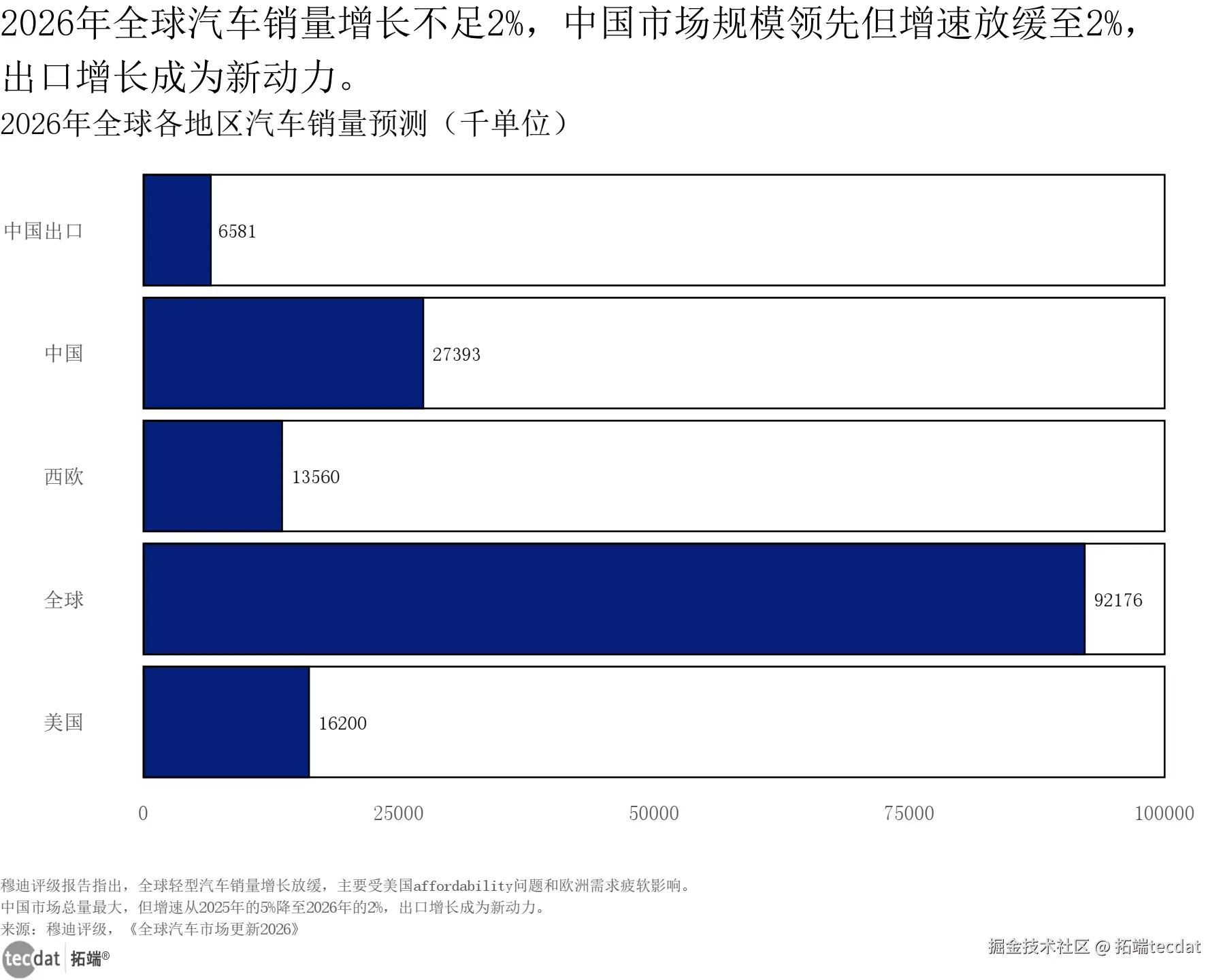 2026年全球汽车销量增长不足2%,中国市场规模领先但增速放缓至2%,出口增长成为新动力。