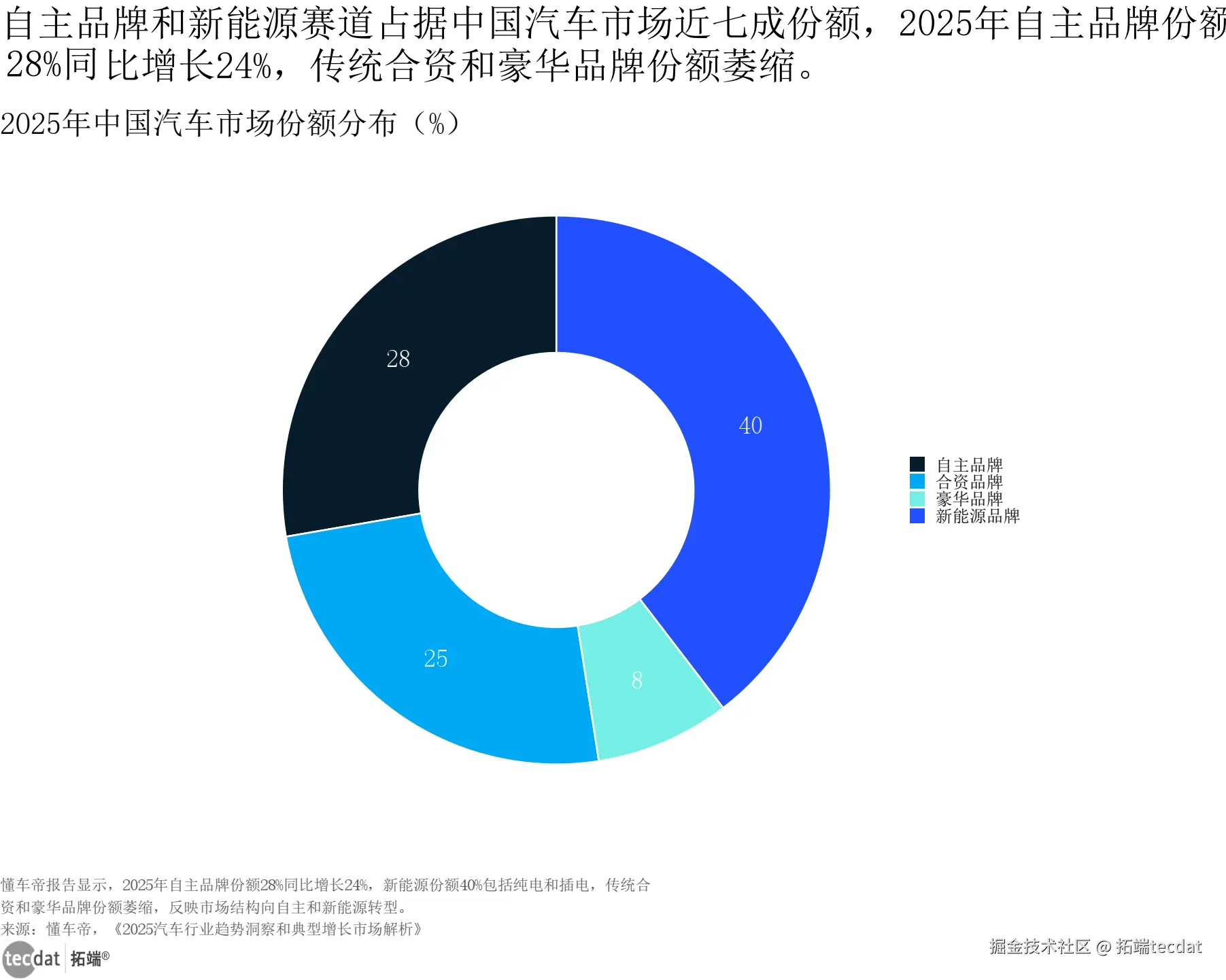 自主品牌和新能源赛道占据中国汽车市场近七成份额,2025年自主品牌份额28%同比增长24%,传统合资和豪华品牌份额萎缩。