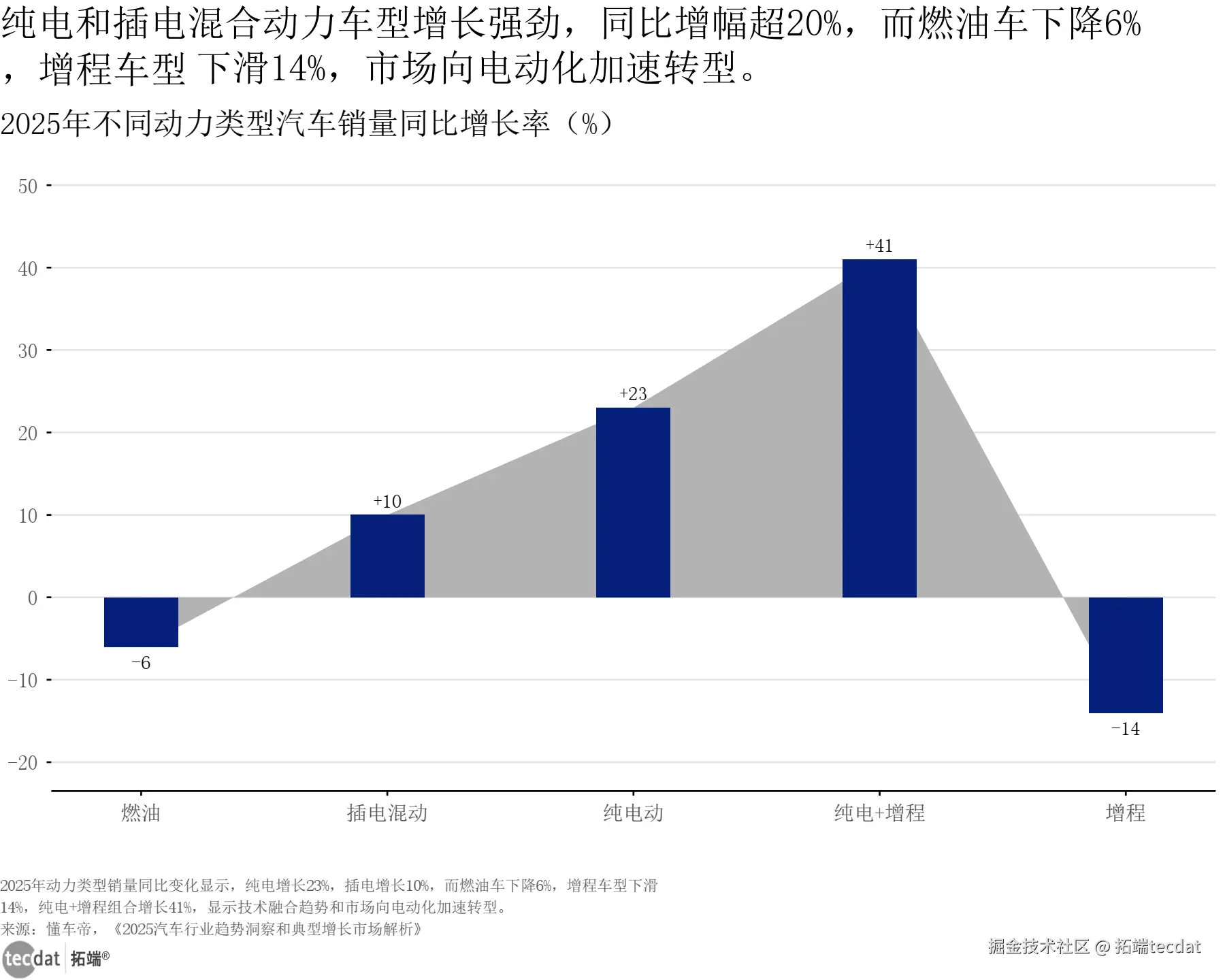 纯电和插电混合动力车型增长强劲,同比增幅超20%,而燃油车下降6%,增程车型下滑14%,市场向电动化加速转型。
