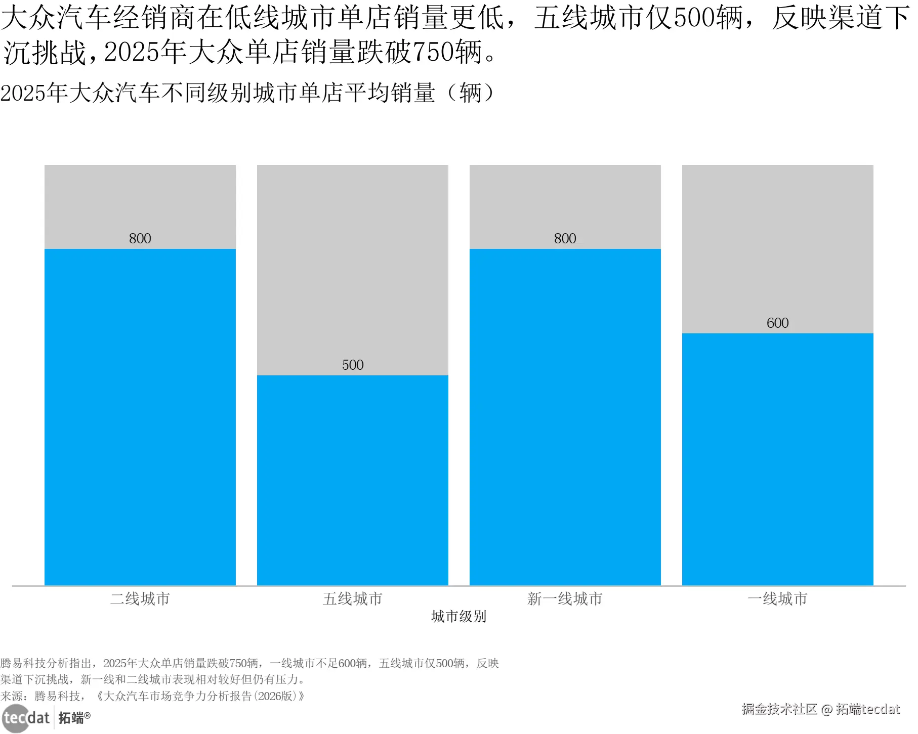 大众汽车经销商在低线城市单店销量更低,五线城市仅500辆,反映渠道下沉挑战,2025年大众单店销量跌破750辆。