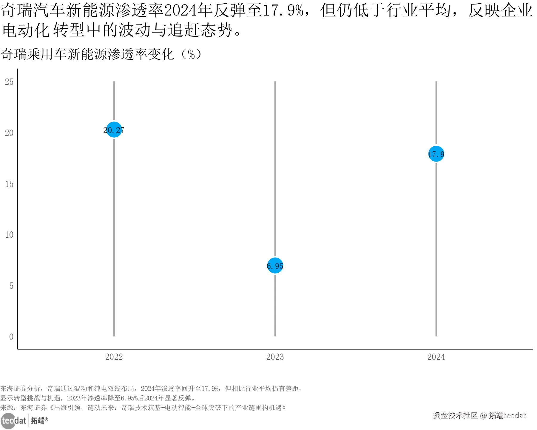 奇瑞汽车新能源渗透率2024年反弹至17.9%,但仍低于行业平均,反映企业电动化转型中的波动与追赶态势。