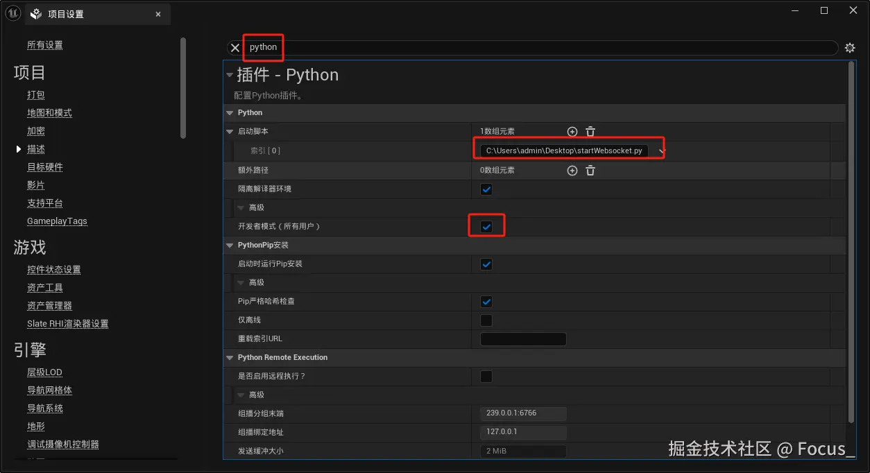- 在“Project Settings”中找到“Python”部分,并启用“Developer Mode”