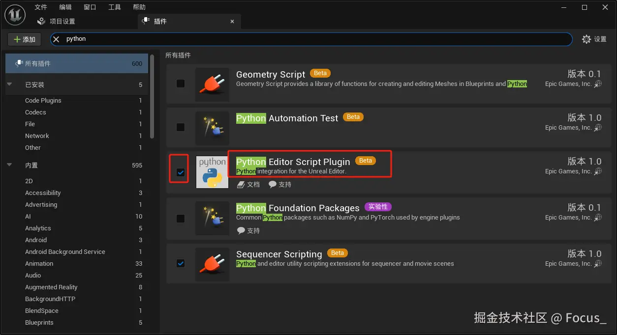 - 编辑器的“Edit”菜单中找到“Plugins”,然后搜索“Python”,并启用“Python Editor Script Plugin”