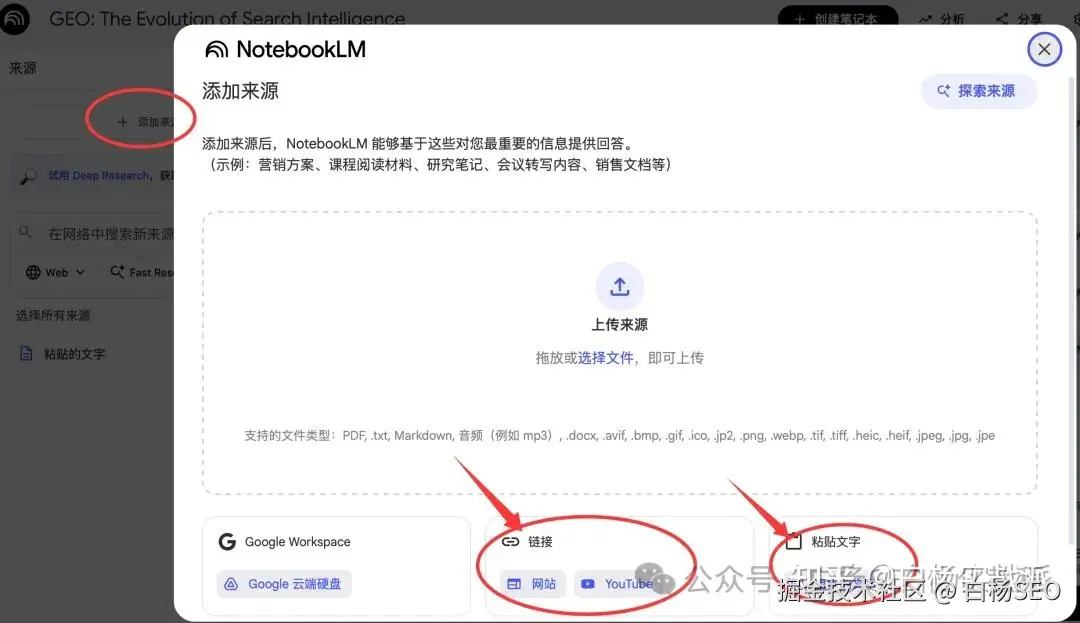 第三,我们在想要做什么之前,需要把内容上传到这个notebooklm里,点添加来源,操作如图。