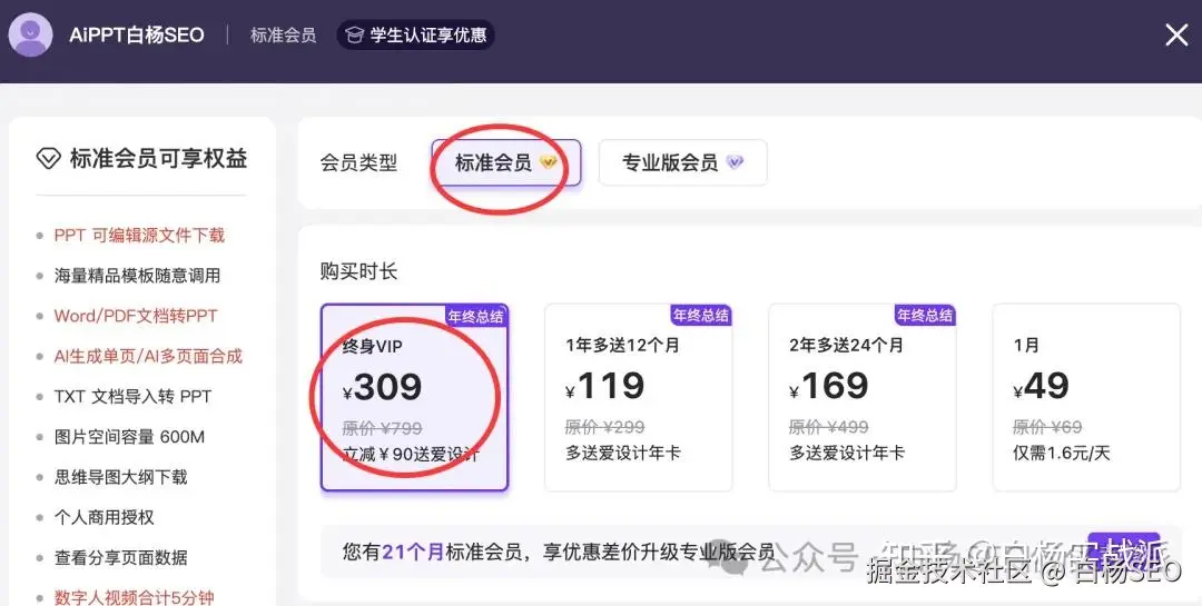 但这个AIPPT一年才一百出头,如果你买终身也才三百多点,如图。