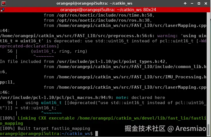 编译成功后,终端会显示 [100%] Built target fastlio_mapping,若出现 pcl::uint16_t 废弃警告,属正常现象,不影响功能使用。