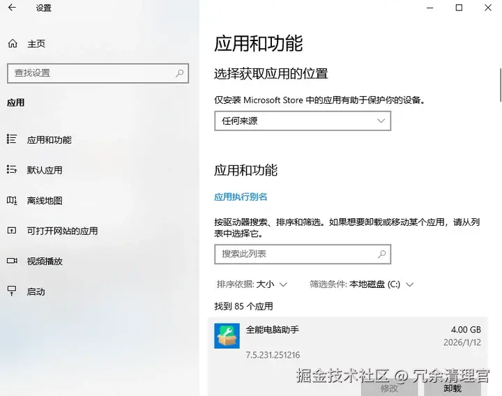2、筛选C盘中的应用程序,可以按应用大小降序,卸载不需要的软件。