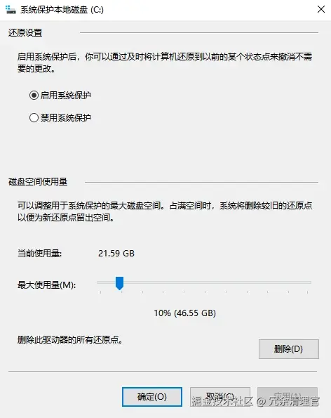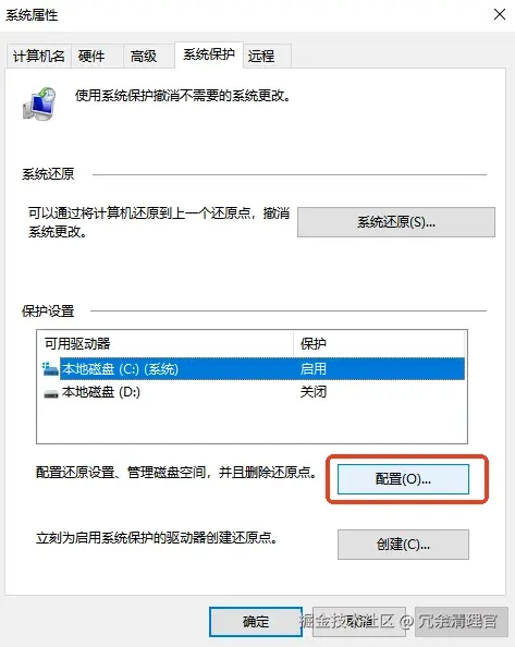 - 清理旧时间锚点: 在“配置”界面,直接点击“删除”按钮。这将清除除最近一个之外的所有还原点。因为你只需要在系统出问题时能回到“上一个可用状态”,无需保留数月甚至数年前的所有历史快照。此操作可一次性释放数GB到数十GB空间。