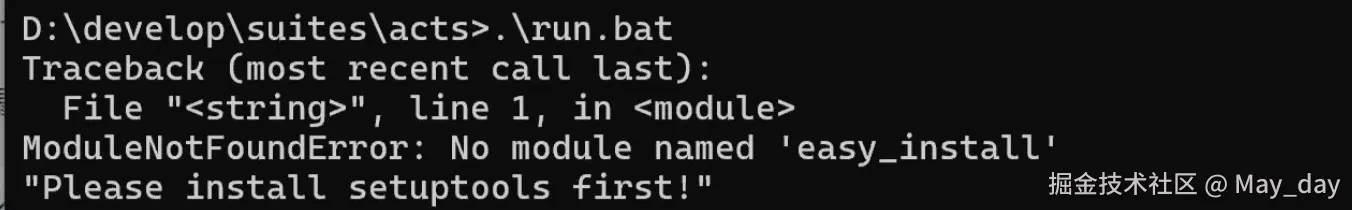 本地在acts目录下执行.\run.bat以后,若遇到以下报错,则说明执行脚本所需要的python环境没有配置好: