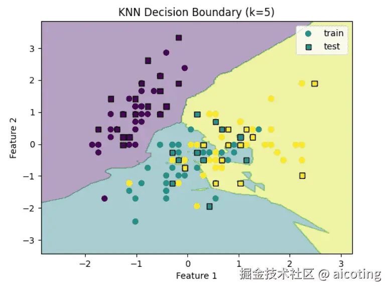 这段代码会绘制出 KNN 分类边界图,直观展示不同类别的划分区域,如下图: