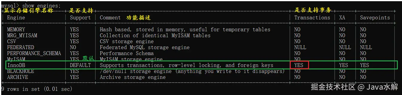 我们在使用事务之前要查看一下,MySQL是否支持事务。在MySQl中支持事务的存储引擎是InnoBD。