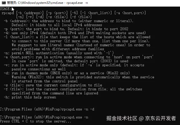 在winpcap的安装文件夹内找到rpcapd程序,在cmd中执行以下命令。