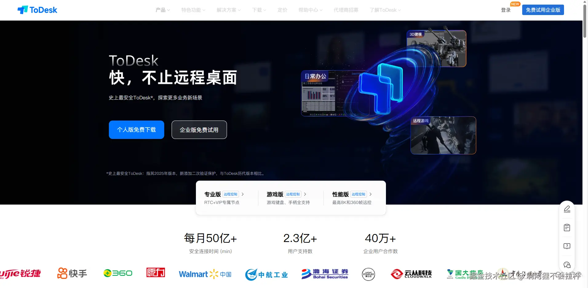 先聊聊当前远程控制圈的主流选手:ToDesk作为后起之秀,以简洁界面和2-3秒快速连接圈粉无数,用户量超2.3亿,国内网络表现稳定,堪称个人办公领域的“性能王”;