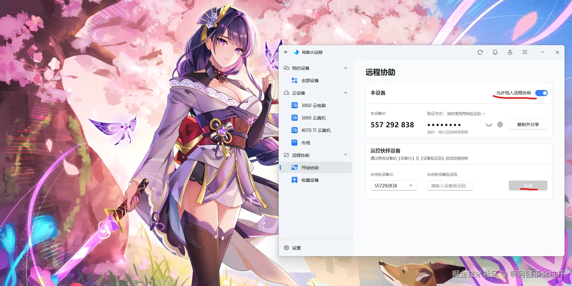 对比ToDesk需要登录才能发起协助、向日葵临时协助仍需绑定账号的繁琐操作,UU远程新增的免登录远程协助功能,直接把临时求助的门槛拉到最低!针对只有单次被协助需求的用户,无需注册登录,打开远程协助界面就能自动生成设备ID和验证码,而且“允许他人远程协助”开关默认开启,把ID和验证码发给协助方就能直接连接,全程零额外操作。