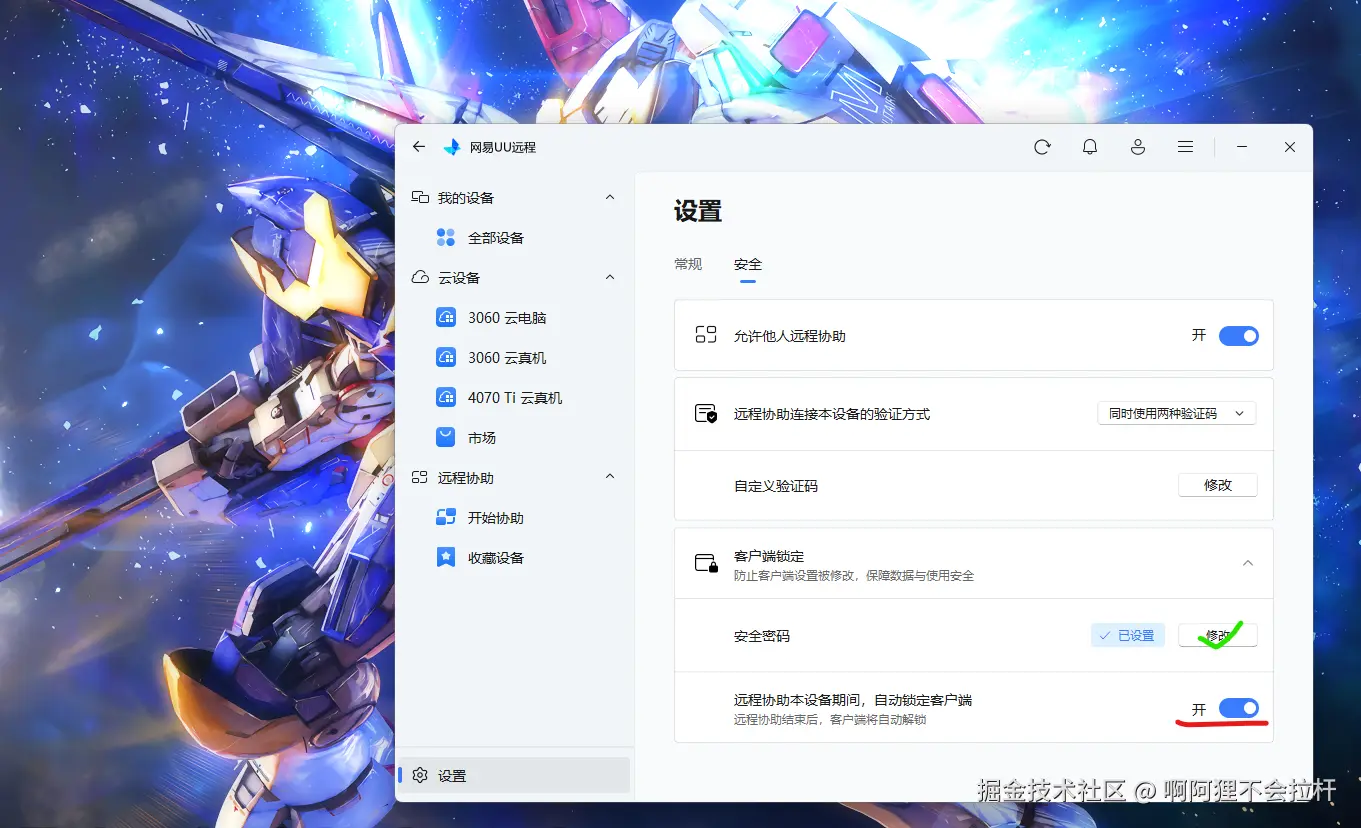 开启“远程协助期间自动锁客户端”后,远控过程中被控端的验证码、验证方式等关键参数都会被牢牢锁定,再也不怕被误改或恶意篡改。如果忘记密码也不用慌,连续3次输入错误后,就能用验证码解锁,双重保障既安全又省心。想要修改安全密码的话。