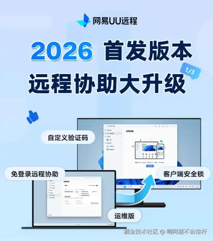 2026年1月起,UU远程开启三轮重磅更新,如今第一阶段已正式落地,更新至V4.12.0及以上版本就能解锁全新体验。这次升级直接让UU远程从“实用款”进阶为“全能六边形战士”,新增的【免登录远程协助】【自定义验证码】【客户端安全锁】【UU远程运维版】四大功能,彻底解决用户痛点,综合实力实现从夯到拉的飞跃!