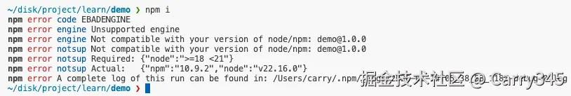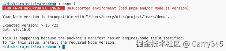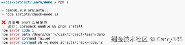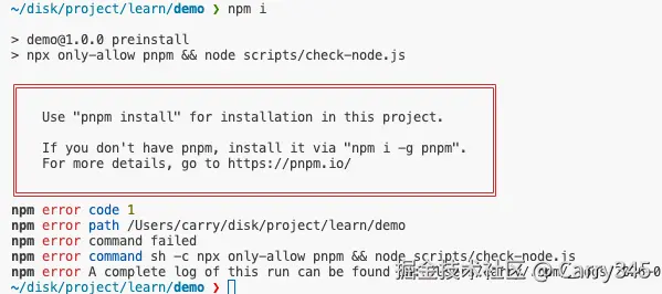 如果有其他脚本,建议把这个放在前面 npx only-allow pnpm && node scripts/check-node.js,此时再用pnpm外的包管理工具可就不行了: