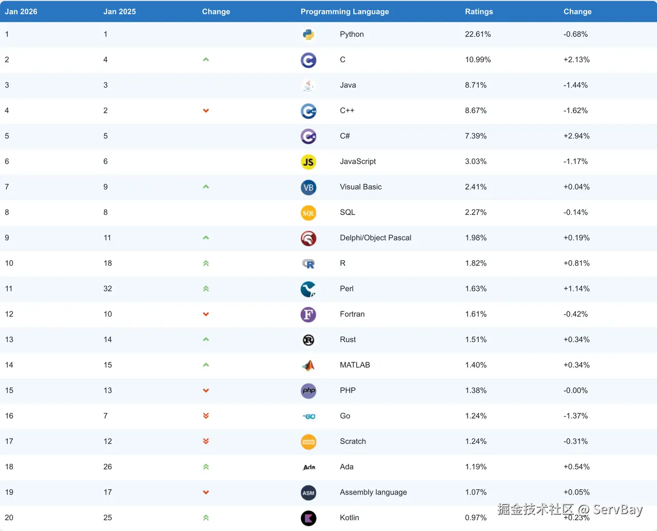 2026年1月TIOBE榜单发布,几家欢喜几家愁。Python依旧稳居榜首,C#再次摘下年度编程语言的殊荣,Rust攀升至历史新高的第13位,而Go则从去年同期的第7位滑落至第16位。