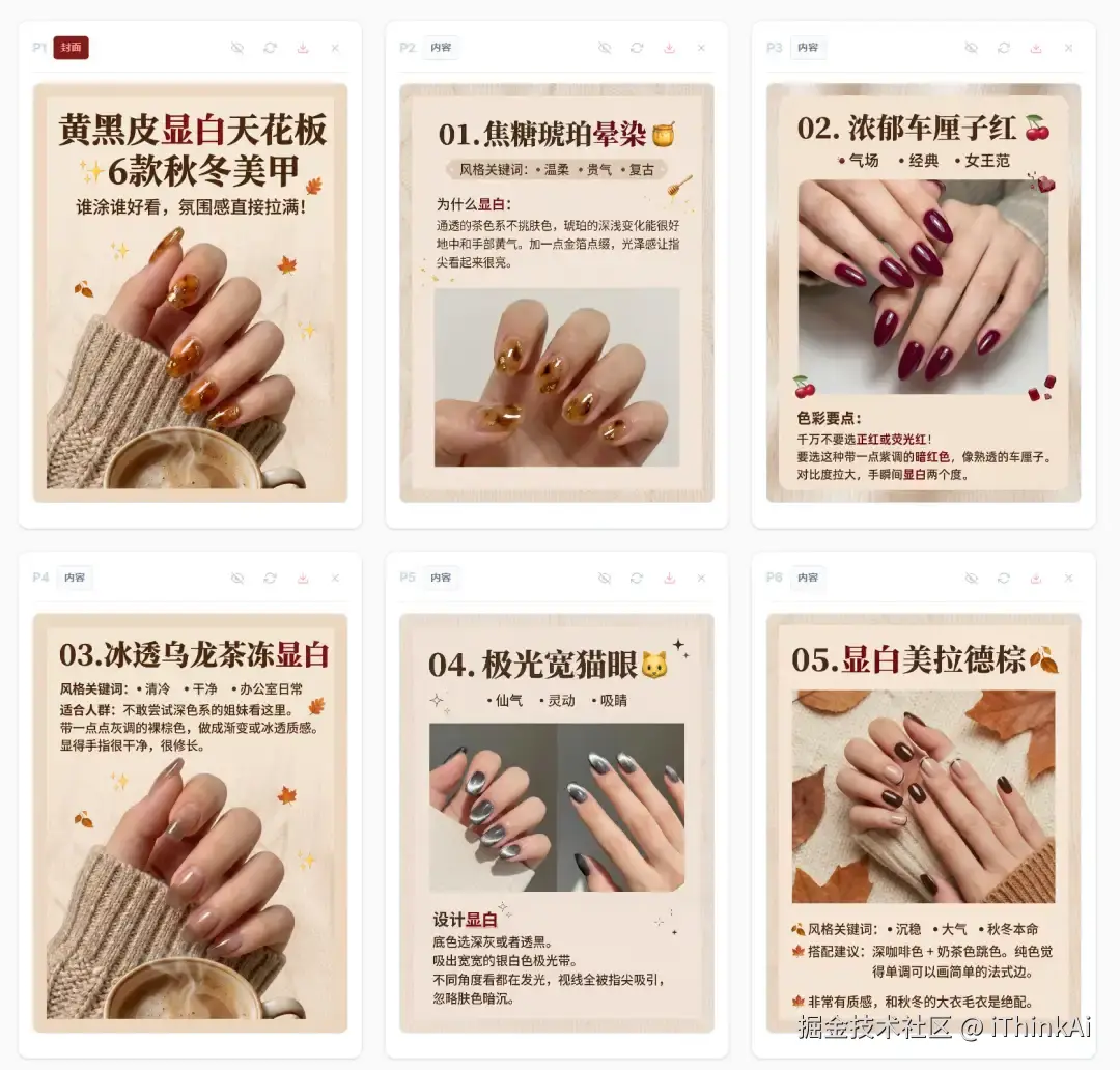 经第 2 轮测试,大家反馈说生成的风格不太统一,我们对此做了优化,确保生成的风格高 度统一(背景色、标题字体、颜色等),这是测试的效果: